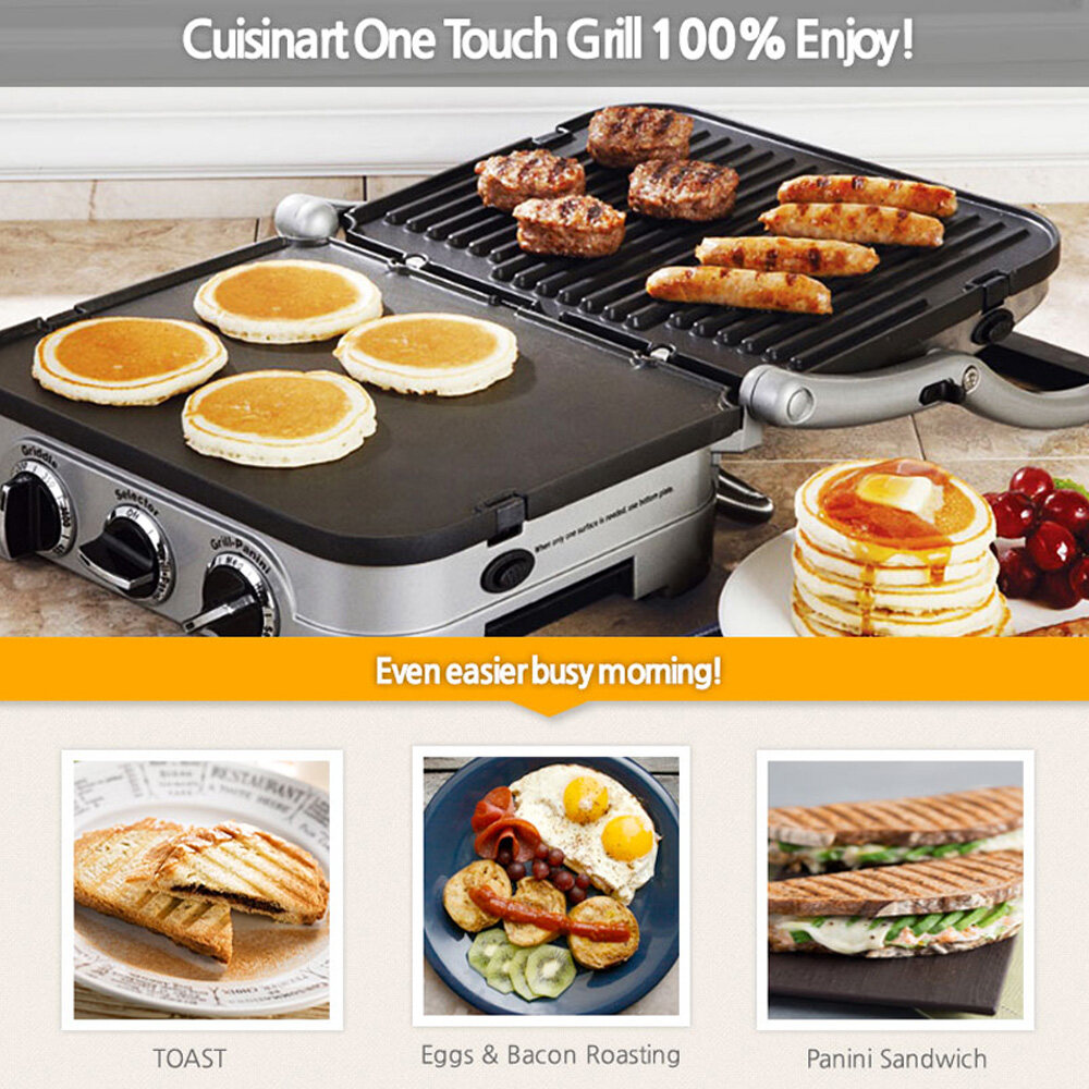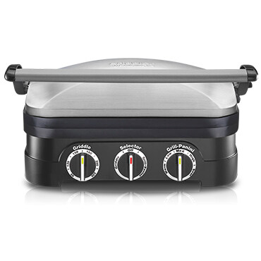 Brushed stainless-steel housing; sturdy panini-style handle; floating cover to adjust to thickness of food
