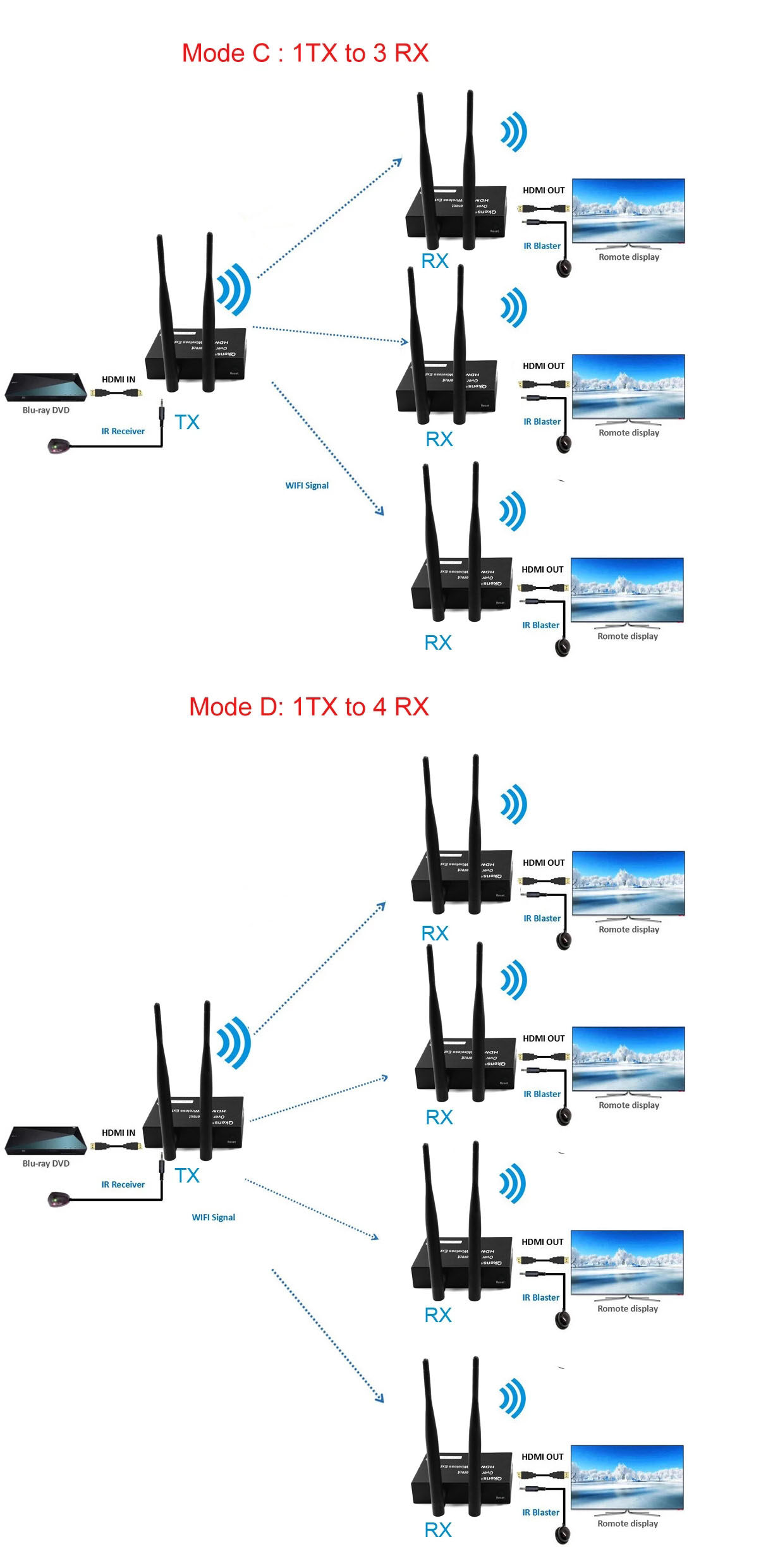1. The product consists of a transmitter and a receiver, which transmits HDMI signals through wireless WIFI, and supports up to 1 transmitter to 4 receivers, 200 meters no obstruction; 164 ft (50 meters) through the wall.