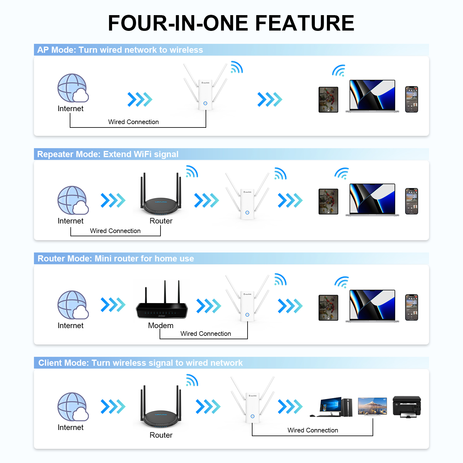 - Please choose the mode that suits you, AP mode turns your wired network into wireless connection; repeater mode enhances your network.