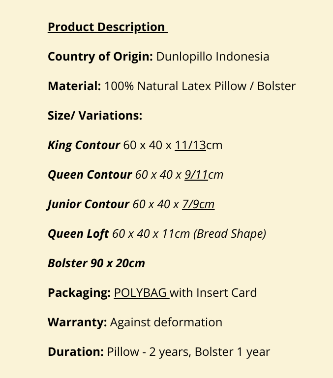 [SG Stocks] Natural Latex Pillow/ Bolster from DUNLOPILLO Indonesia - HYPOALLERGENIC & ANTI-MICROBIAL, Superior Neck Support. 邓禄普天然乳胶枕